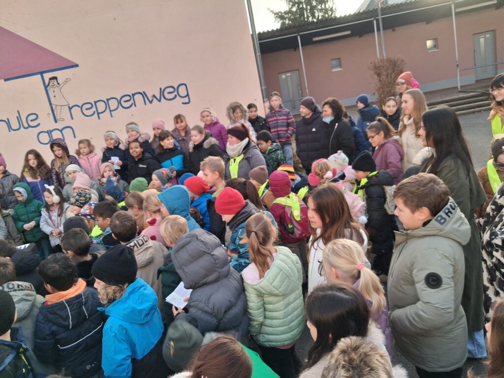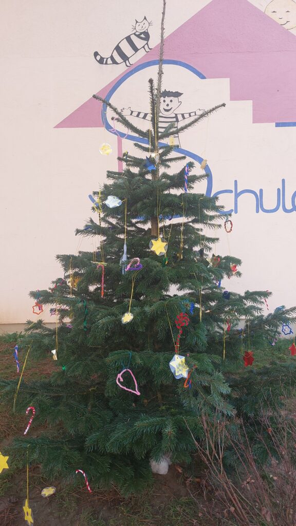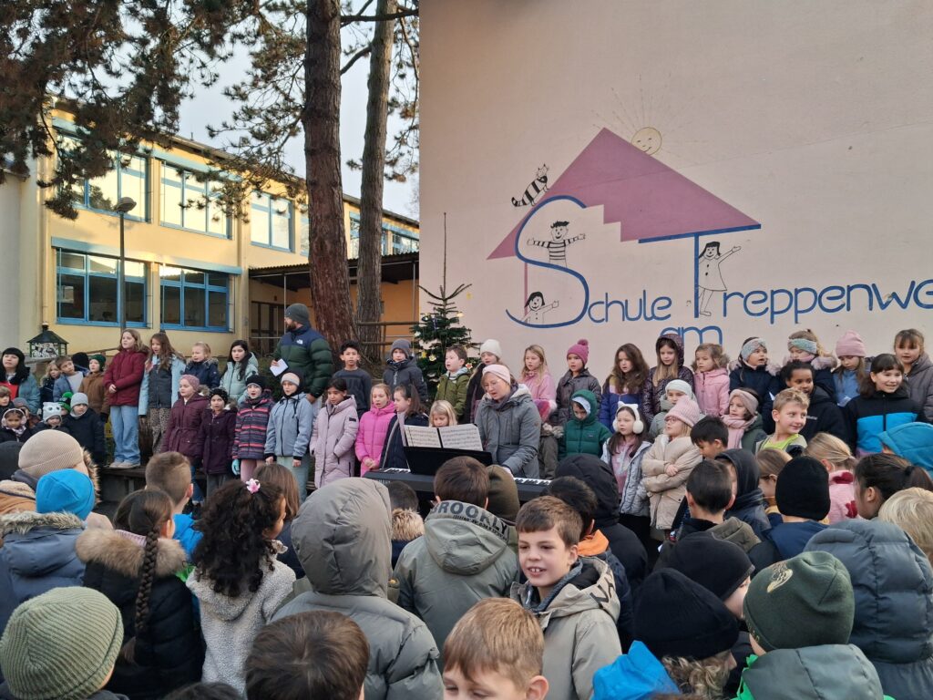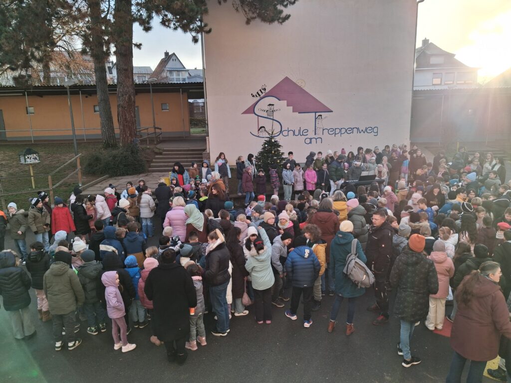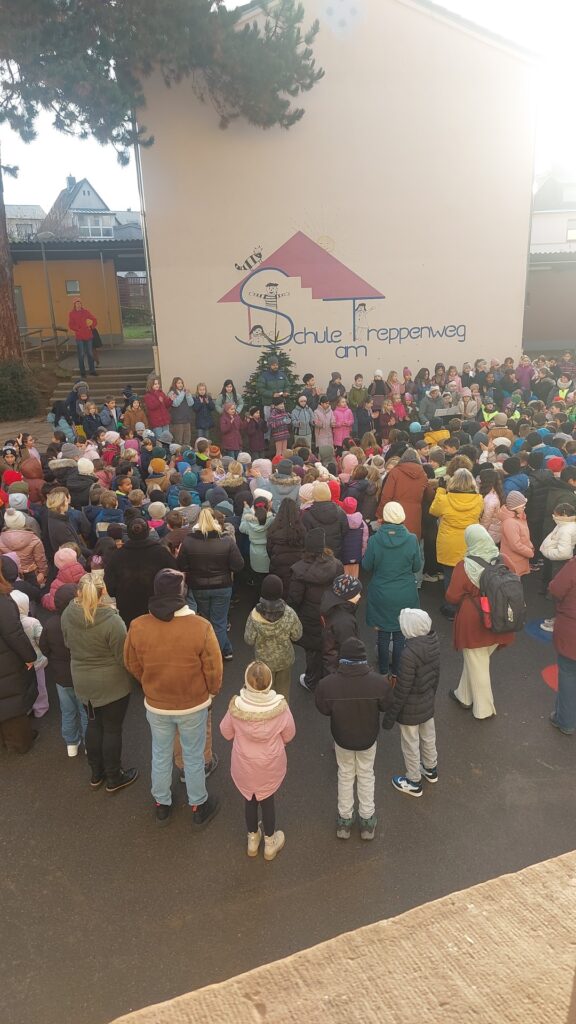 Auch in diesem Advent sollte die Tradition der letzten Jahre fortgesetzt werden. Und so kam es, dass sich am Montag nach dem ersten Advent alle Kinder und Lehrkräfte der Schule am Treppenweg auf dem Pausenhof trafen und gemeinsam Weihnachtslieder sagen. Frau Fritz-Goltermann begleitete die Lieder mit dem E-Piano, vielen Dank dafür. Auch der Weihnachtsbaum, finanziert vorm Förderverein, stand schon bereit. Danke an die ersten Klassen, die diesen so toll schmückten.