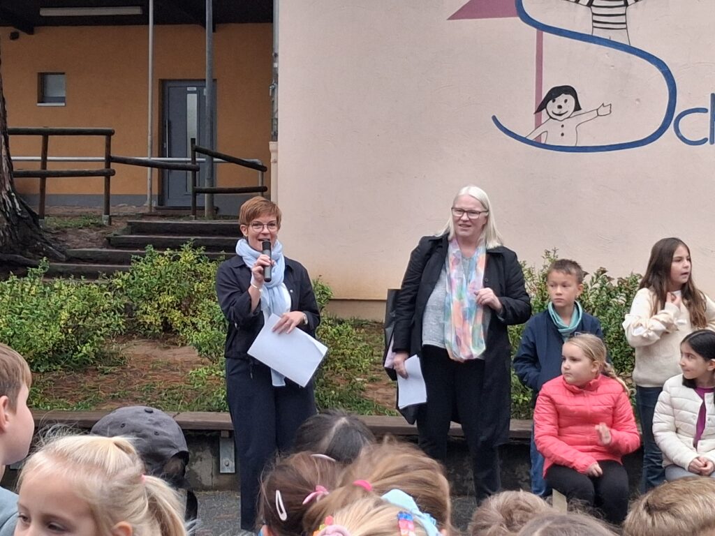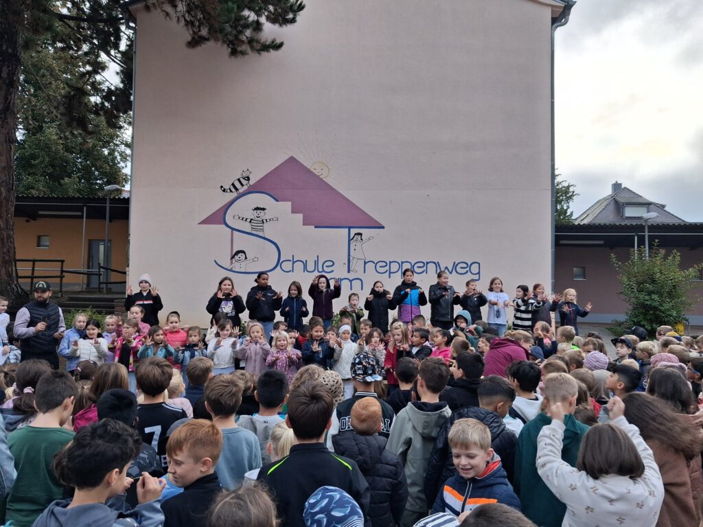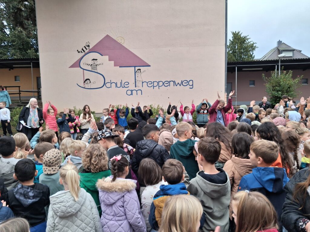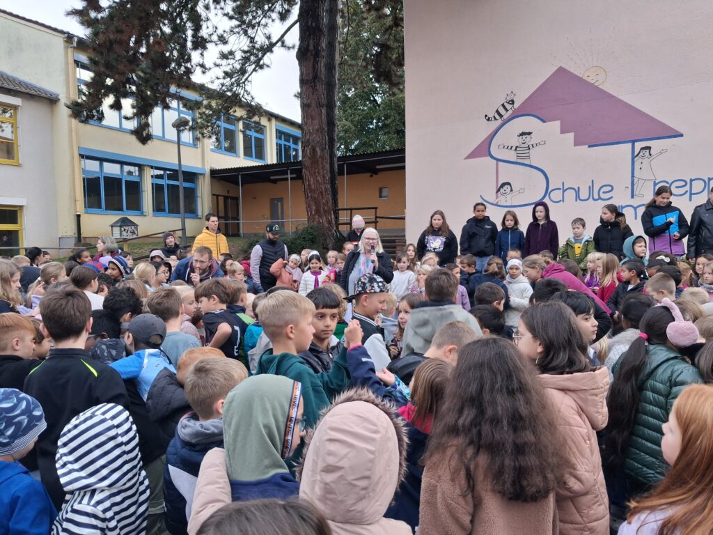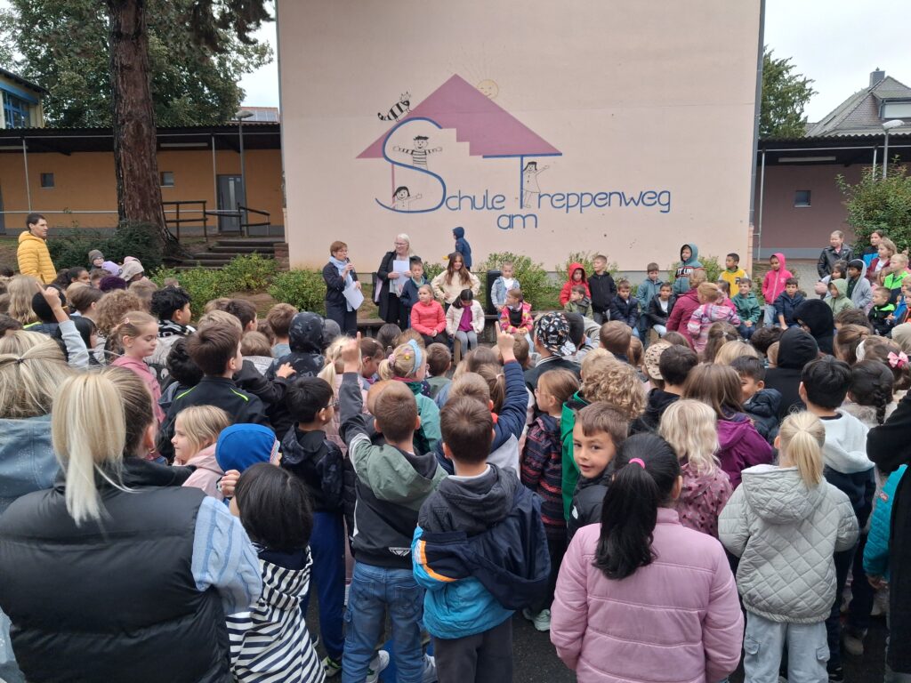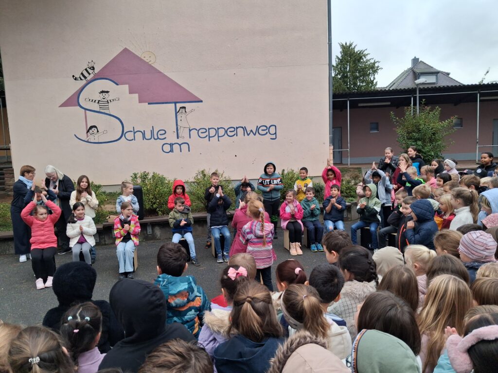 Am Ende der 3 Wochen trafen sich erneut alle Kinder der Schule mit ihren Lehrkräften, um die Zeit Revue passieren zu lassen. Die Klasse 2b begrüßte alle mit einem Zu-Fuß-Klassenrap. Es folgte noch ein gemeinsames Lied und auch der Chor präsentierte einen neuen Song zum Thema.