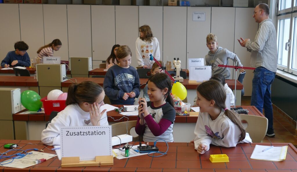 Traditionell nehmen neben dem MINT Profil der fünften Jahrgangsstufe und einigen sechsten Klassen auch Kinder der Schule am Treppenweg teil. Gerade die Kooperation mit dieser Schule fördert hierbei die Verzahnung von Grundschule und weiterführender Schule und trägt dazu bei, den Übergang für die Kinder zu erleichtern. Entsprechend bot der Tag Gelegenheit, spannende und spaßige Experimente gemeinsam in gemischten Teams durchzuführen. Zwischen 09:35 Uhr und 12:55 Uhr galt es so, einen abwechslungsreichen Parkour in den Fachräumen der Chemie zu bestehen, in dem sich die teilnehmenden Schülerinnen und Schüler beispielsweise mit der Chromatographie von Filzstiften, der Konstruktion einer Leonardo-Brücke, dem Bau eines Feuerlöschers, dem Einfluss der Temperatur auf Mehlwürmer und schwebenden Eiern beschäftigten.