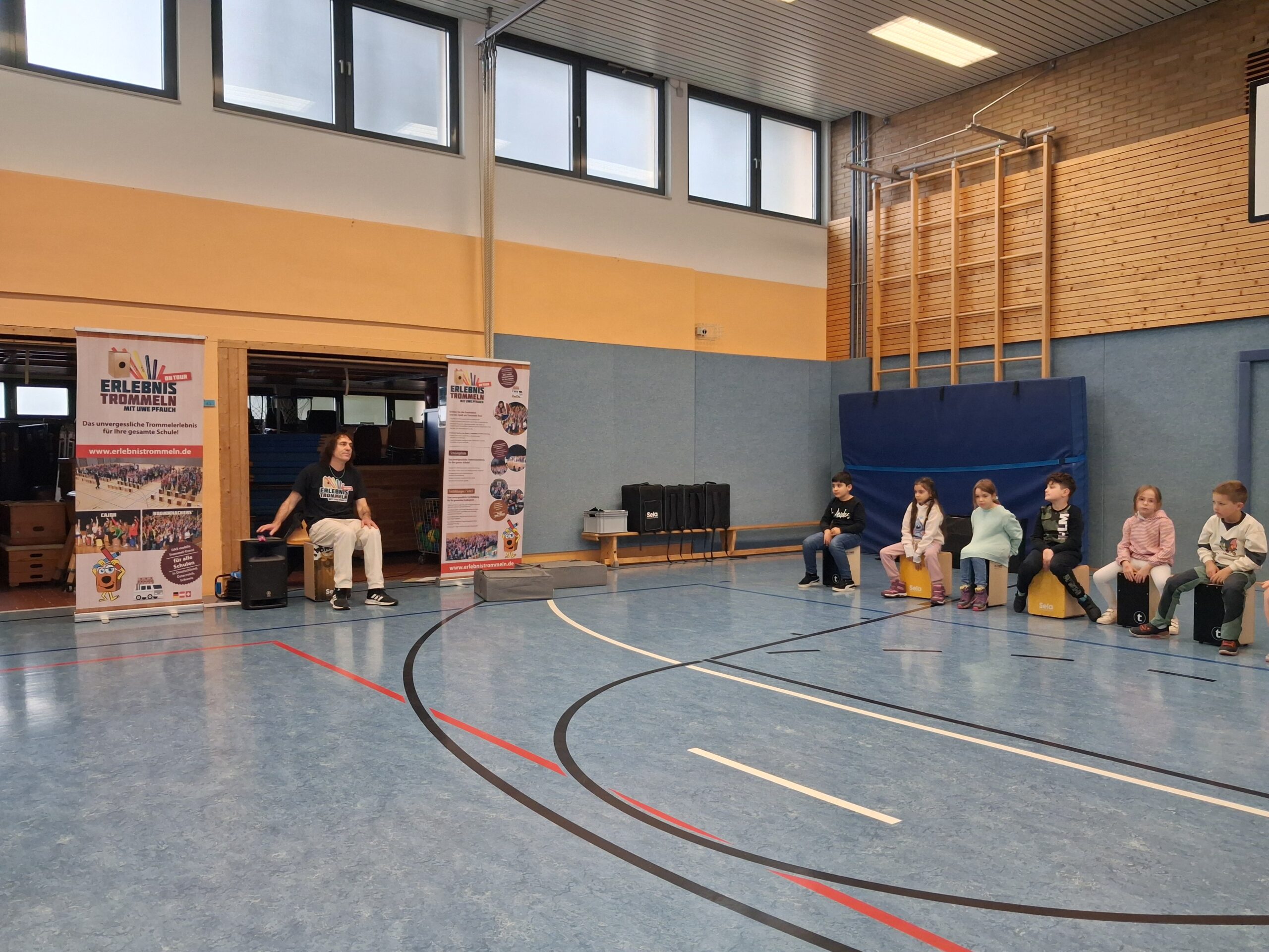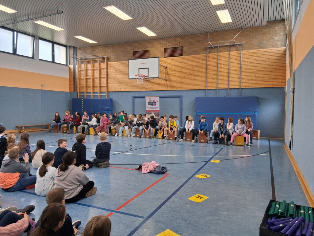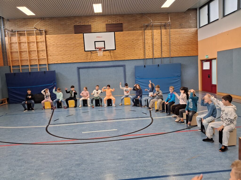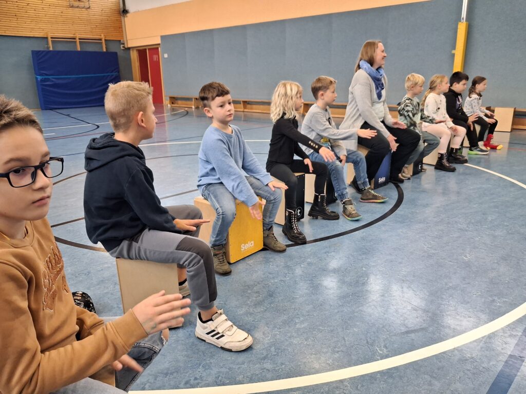 Nun konnte es losgehen und alle Kinder einer Klasse spielten zunächst auf den vielen mitgebrachten Cajons. Alle waren mit viel Freude dabei und folgten konzentriert den Anweisungen von Herrn Pfauch. So gelang es, dass jede Gruppe mehrere bekannte Hits mit den Cajons begleiten konnte.