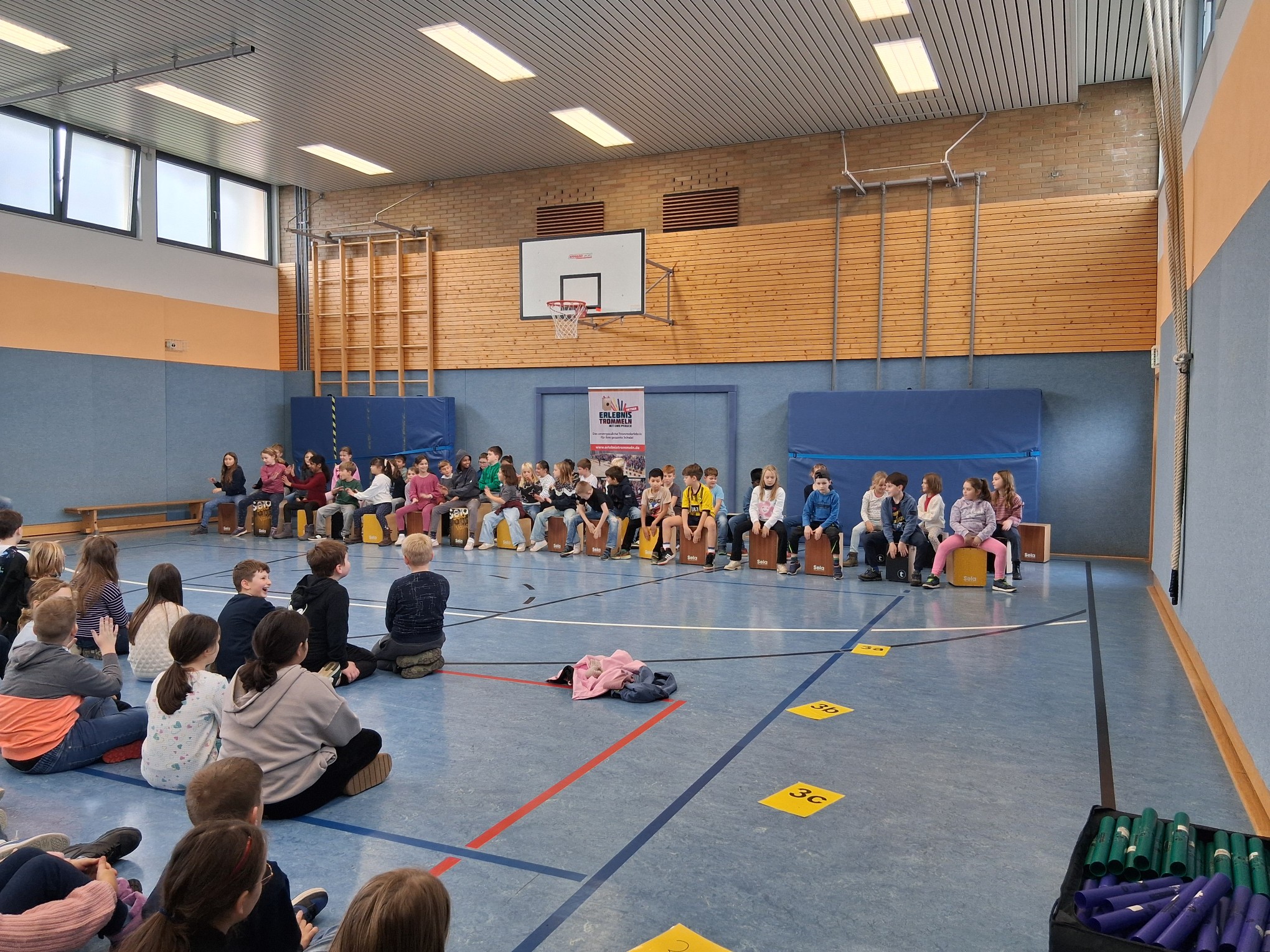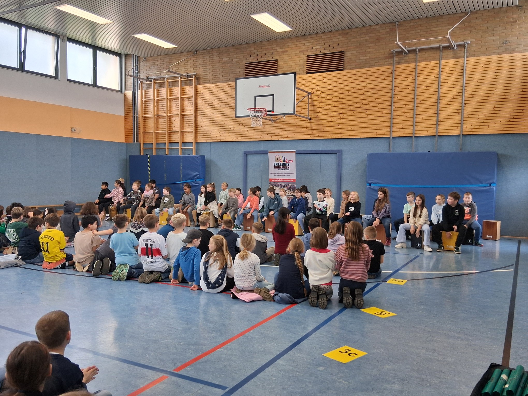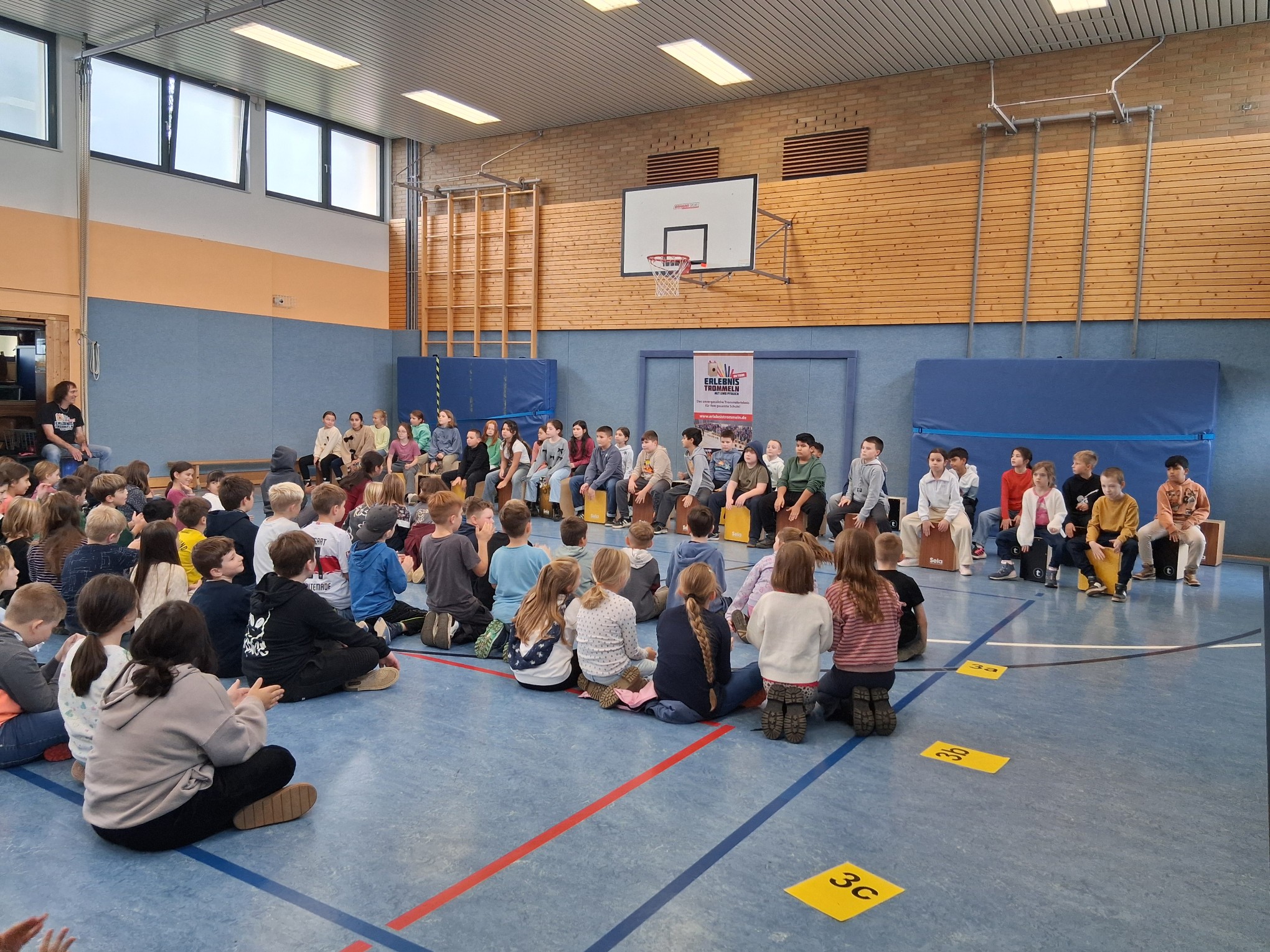 Nun konnte es losgehen und alle Kinder einer Klasse spielten zunächst auf den vielen mitgebrachten Cajons. Alle waren mit viel Freude dabei und folgten konzentriert den Anweisungen von Herrn Pfauch. So gelang es, dass jede Gruppe mehrere bekannte Hits mit den Cajons begleiten konnte.