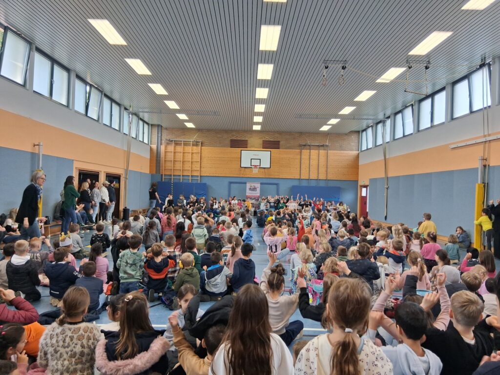 Als Highlight der Woche durften die Kinder aus Jahrgang 3 und 4 ihre erarbeiteten Stücke in einem Konzert präsentieren. Dafür traf sich die gesamte Schulgemeinde nochmals zusammen in der Turnhalle.