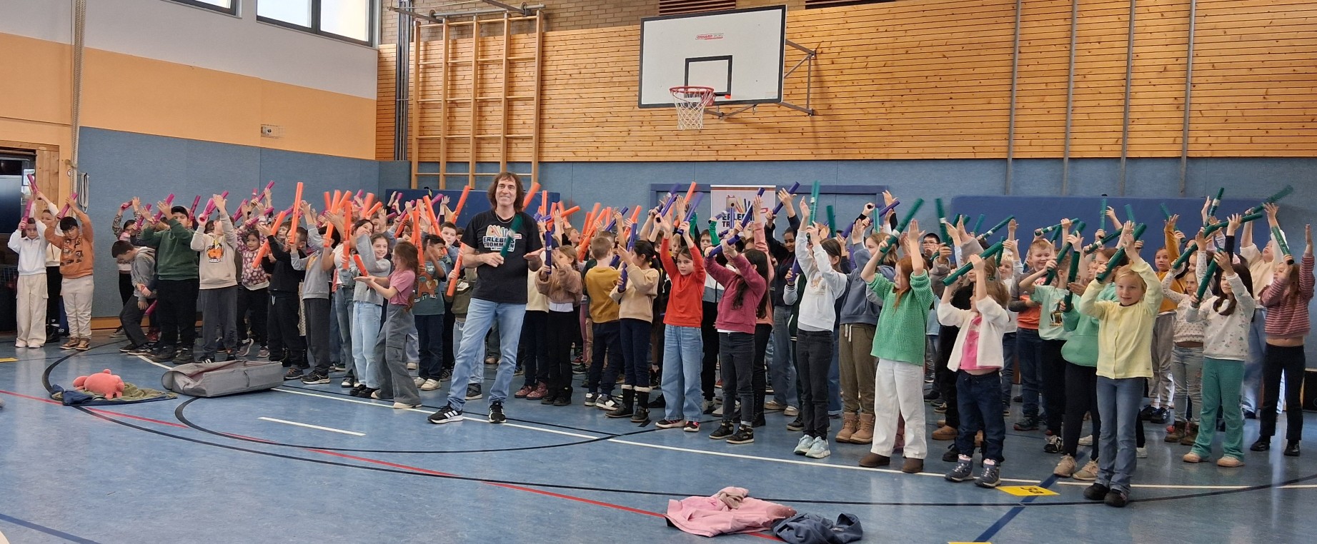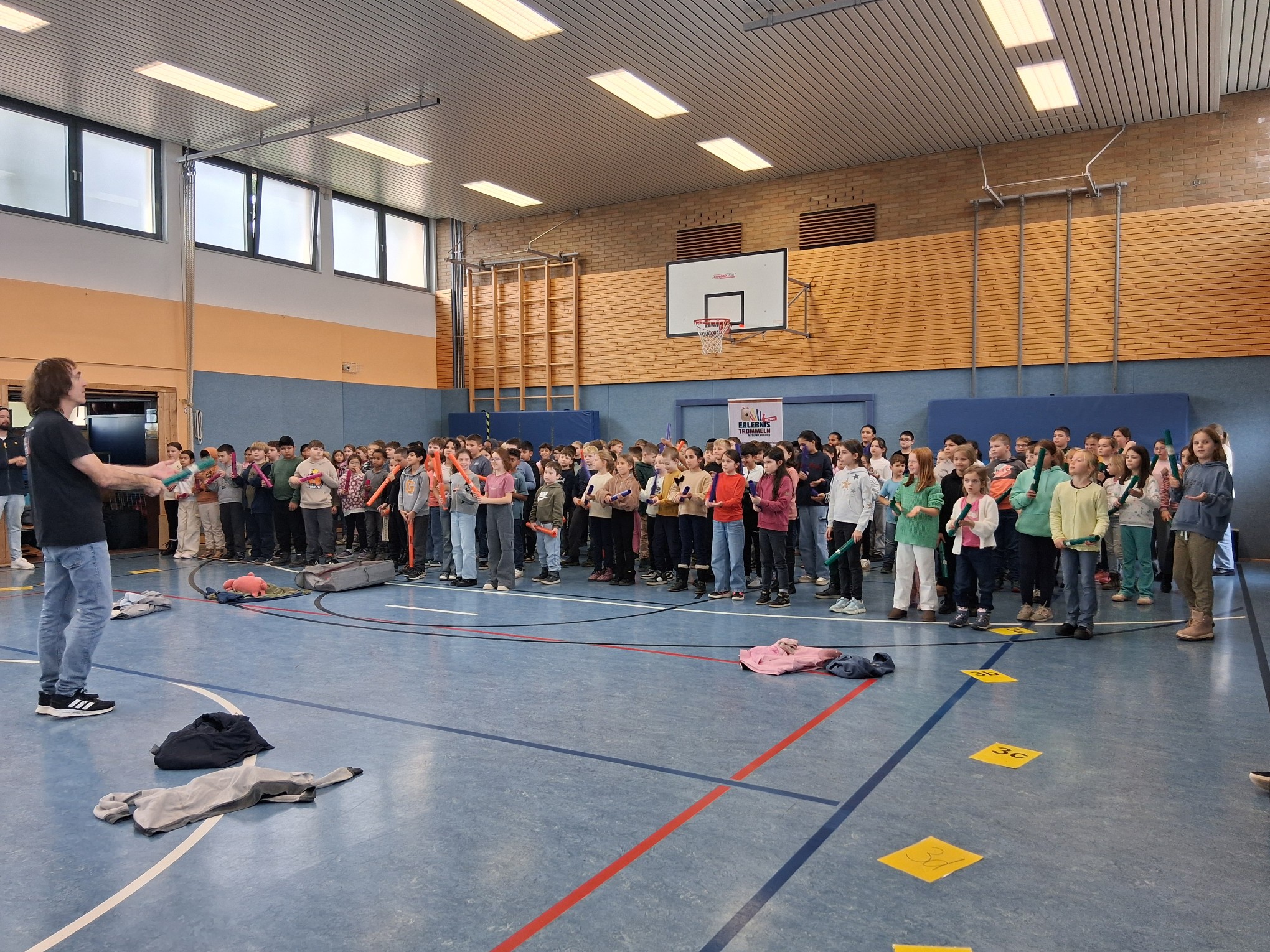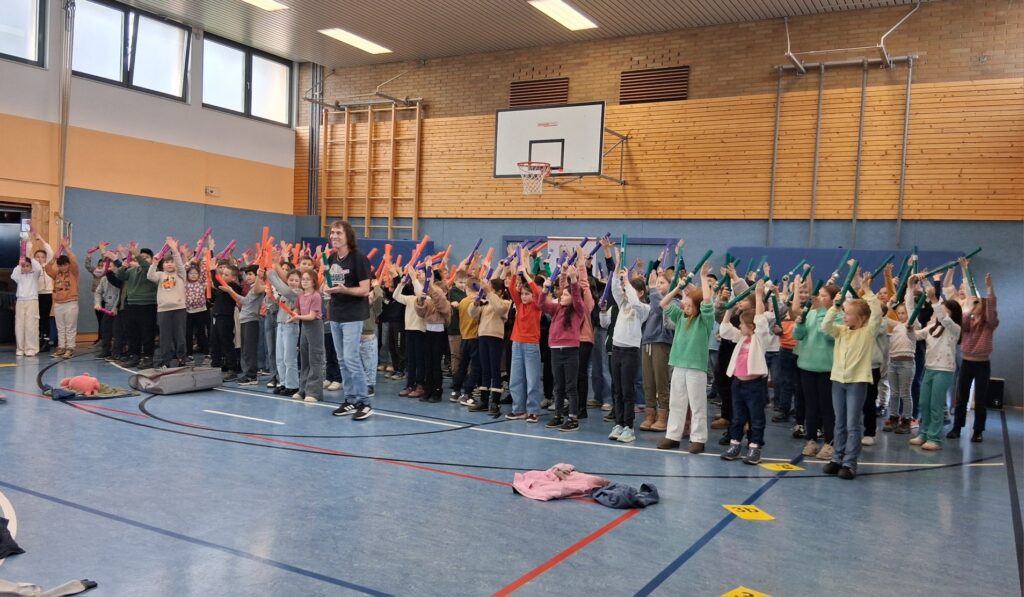 Eine Woche lang hatte jeden Tag ein anderer Jahrgang die Möglichkeit gemeinsam mit Herrn Pfauch in der Turnhalle zu musizieren. Dafür hatte er jede Menge Intrumente und tolle Ideen mitgebracht.